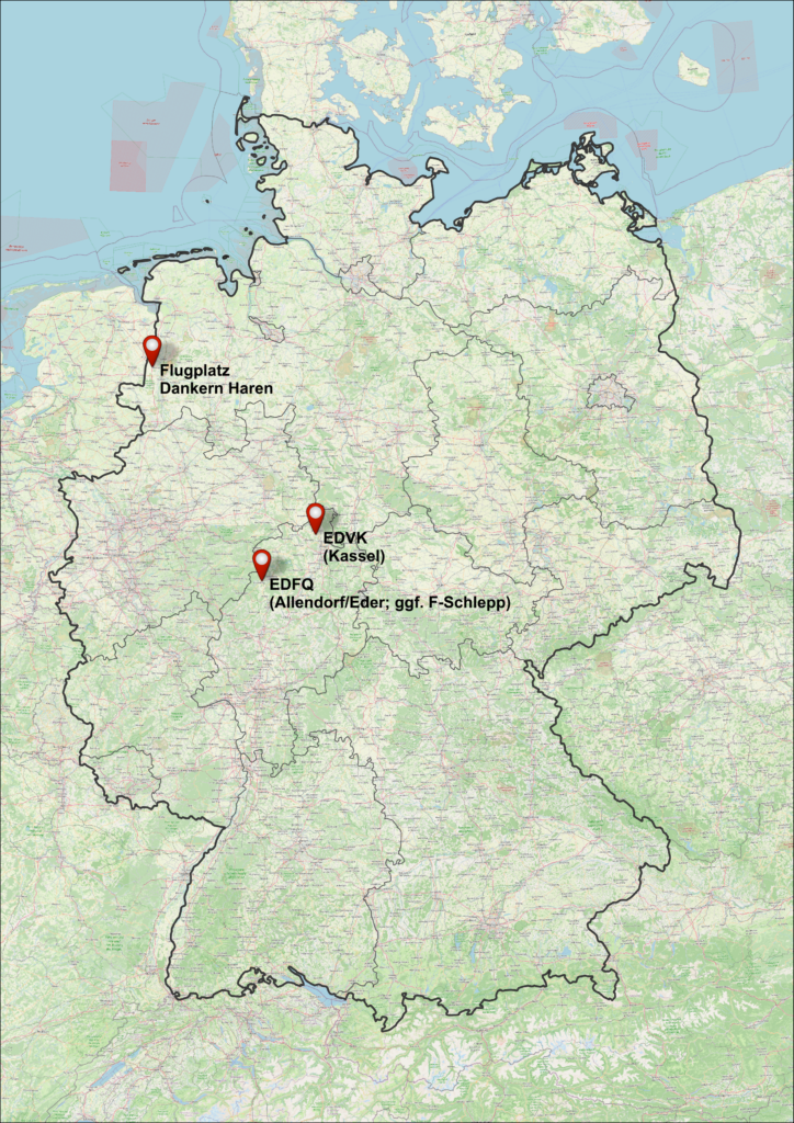 Bitte beachten Sie, dass F-Schlepp am Verkehrsflughafen Kassel leider nicht möglich ist. Alternativ können Probe-F-Schlepp am Flugplatz  Allendorf/Eder (EDFQ) durchgeführt werden.
